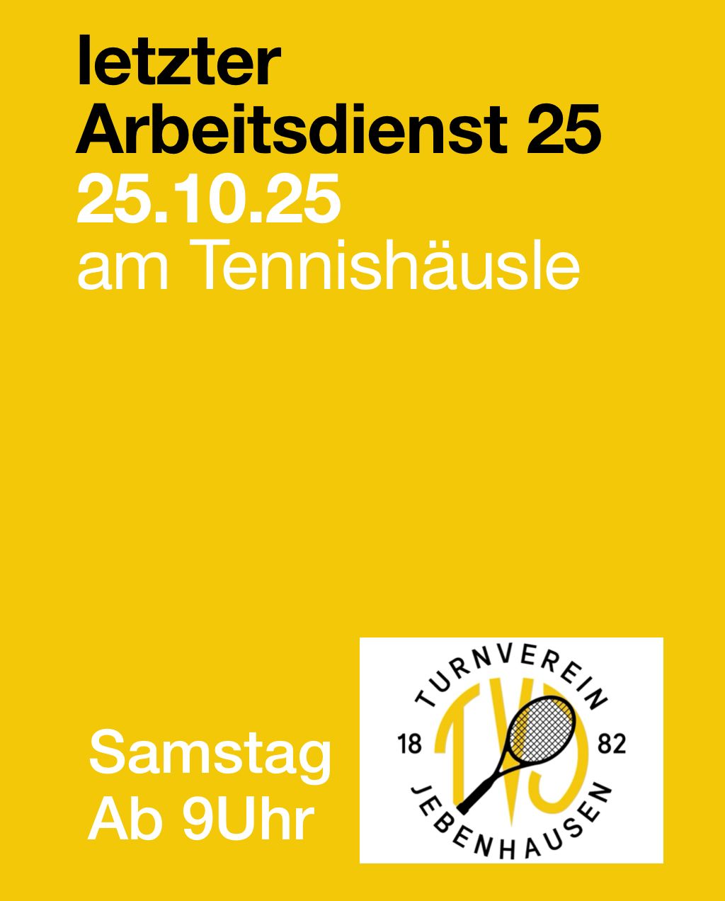 Letzter Arbeitsdienst der Tennisabteilung 2025 Der letzte Arbeitsdienst dieses Jahres findet am Samstag, den 25. Oktober 2025, auf unserer Tennisanlage statt.Beginn ist wie gewohnt um 9:00 Uhr. Die Abteilungsleitung freut sich auf zahlreiche Unterstützung. Zurück Weiter